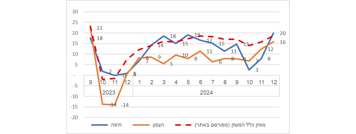מאזן לפי מחוז: ניכר שיפור ממשי במאזן הכלכלי של עסקים במחוזות צפון וחיפה בחודש דצמבר (שבו הייתה הפסקת אש). מאזן הנטו של מחוז הצפון הוא 16 לאחר שלאורך שנת 2024 הוא נע בין 7 ל-11. במחוז חיפה המאזן עלה ל-20 לאחר ירידה חדה ל-3 בחודש אוקטובר (עקב ההסלמה והתרחבות טווח השיגורים מתחילת אוקטובר).
