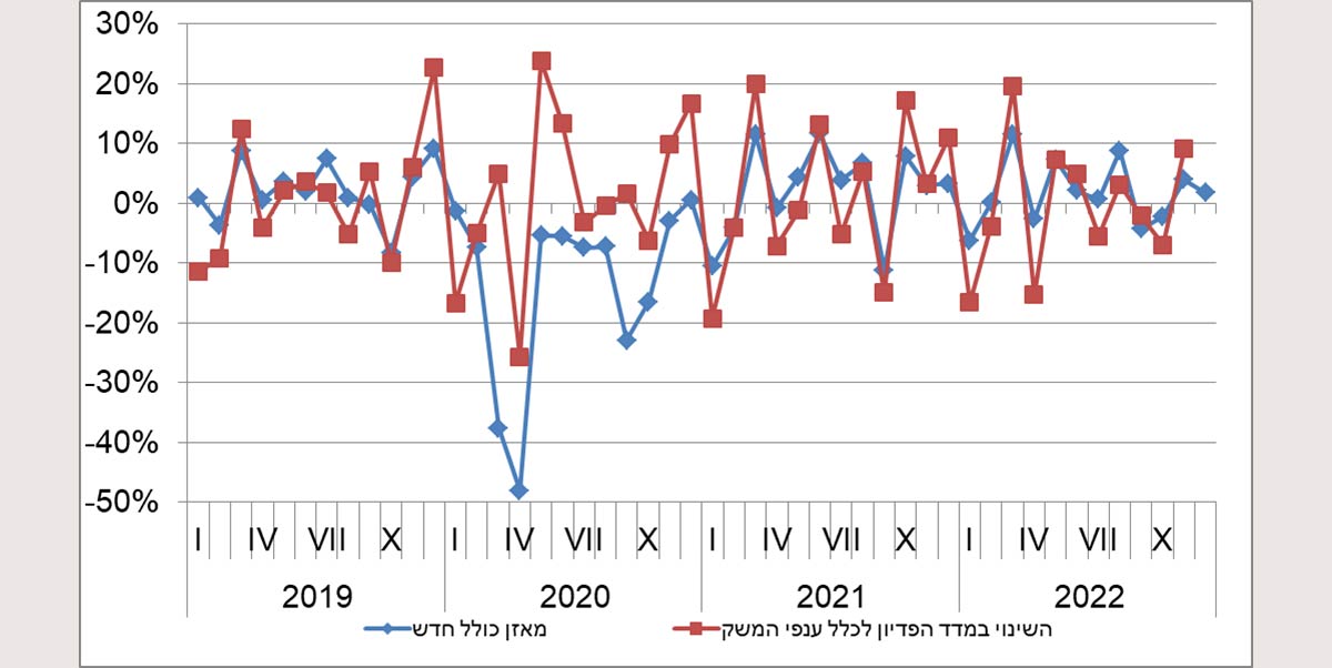 היקף העבודות החדשות (שטח התחלות הבנייה / היקף ההזמנות) | -0.2 | -8.8 | -4.2 | -2.0 | 2.5 | -4.0 |