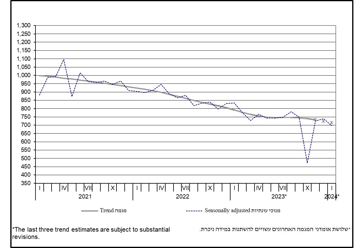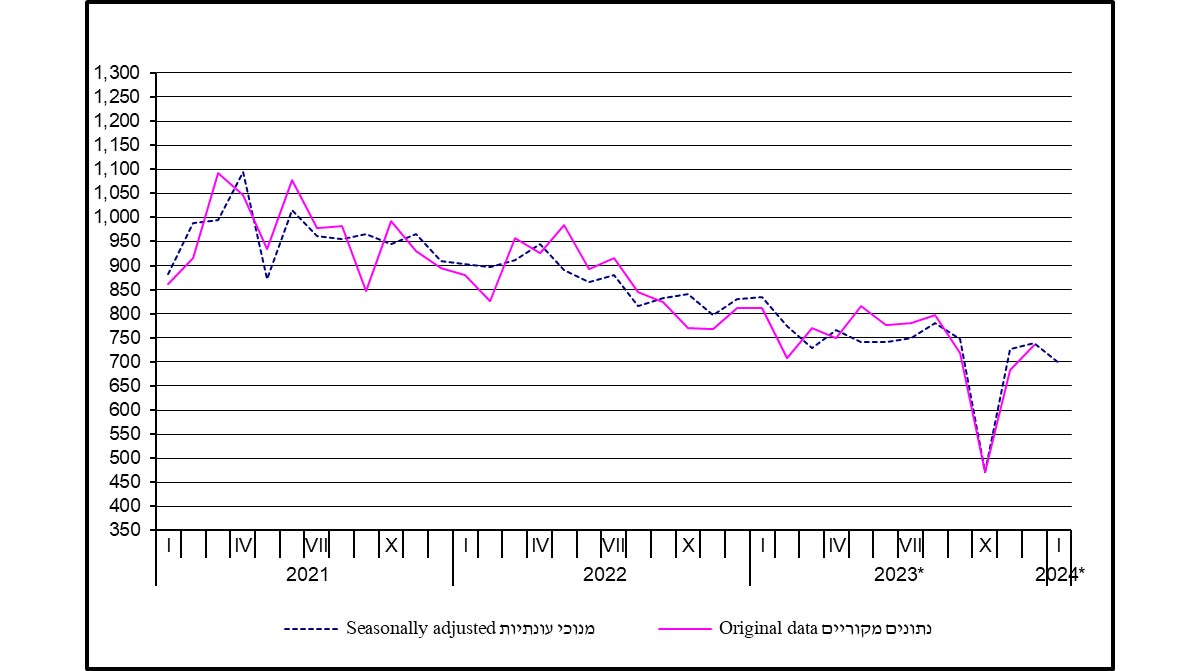 * בחודש ינואר 2024 היו ארבעה הרוגים יותר מחודש ינואר 2023 (33 לעומת 29) ו-11 הרוגים יותר ממוצע חודשי ינואר בשנים 2022-2020 (22).