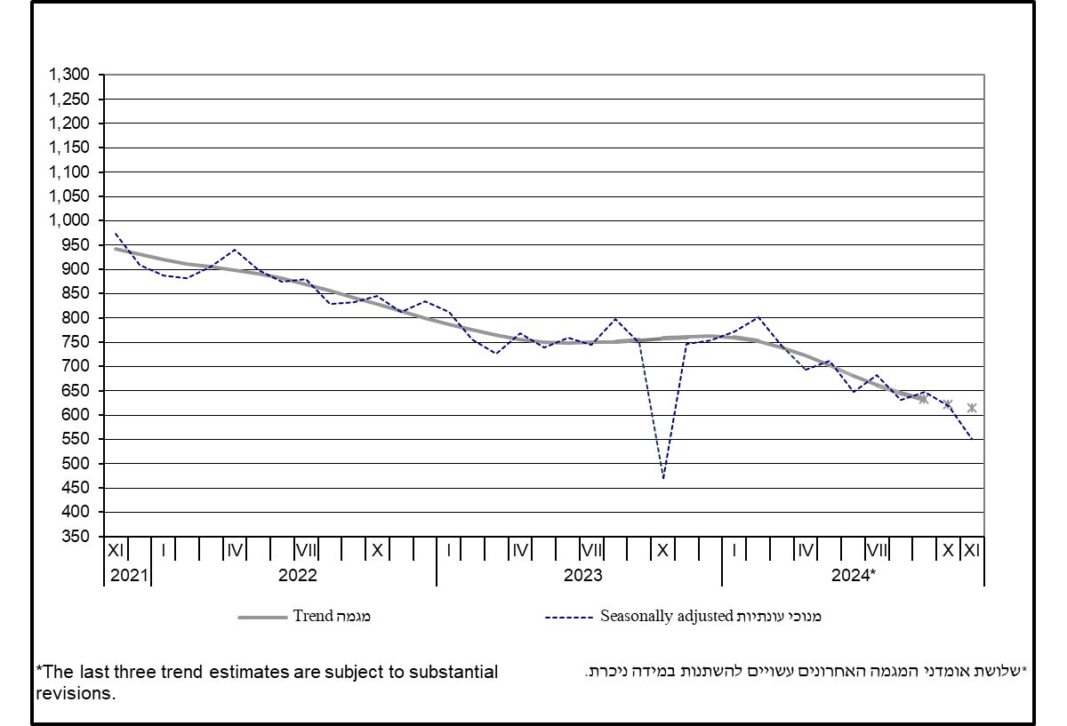 נתוני המגמה של מספר הנפגעים מלמד שעד חודש נובמבר 2024 נרשמה ירידה בקצב של 2.1% בממוצע לחודש, לאחר עלייה של 0.1% מחודש אוגוסט עד אוקטובר 2023.