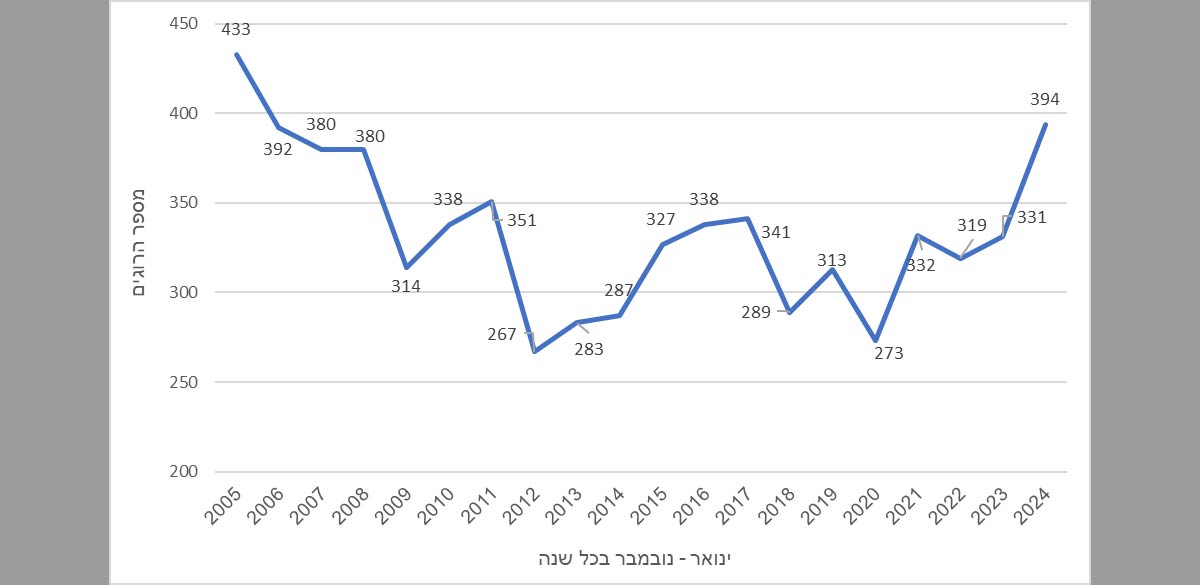 מחודש ינואר ועד חודש נובמבר 2024 היו 394 הרוגים בתאונות דרכים - 63 הרוגים יותר מהתקופה המקבילה בשנה שעברה (331 הרוגים בין החודשים ינואר לנובמבר 2023). בתקופה זו היה מספר ההרוגים הגבוה ביותר ב-18 השנים האחרונות.