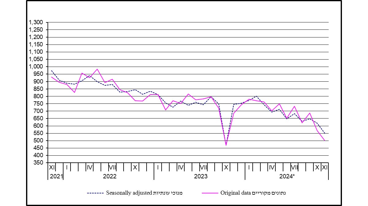 להלן נתונים על תאונות דרכים עם נפגעים שאירעו בחודש נובמבר 2024 לעומת חודש נובמבר 2023 וממוצע חודשי נובמבר 2022-2020. נתוני שנת 2024 הם ארעיים וממשיכים להתעדכן על ידי משטרת ישראל. נתוני השנים 2023-2020 הם סופיים.