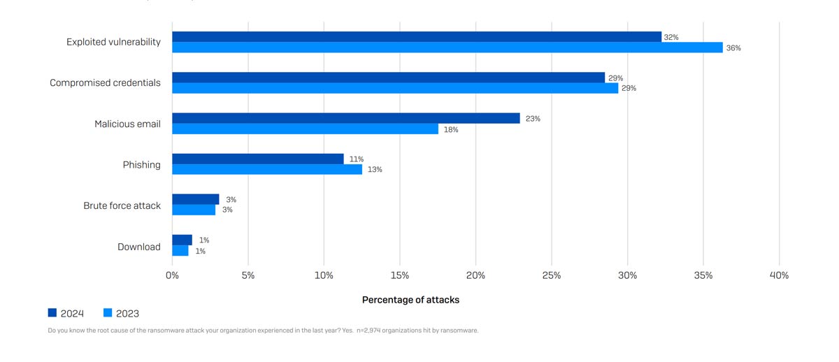 זו השנה השנייה ברציפות, שניצול נקודות תורפה היו הגורם העיקרי להתקפה, מה שהשפיע על 32% מהארגונים. גורמים נוספים למתקפות הם ניצול הרשאות (29%) ודוא"ל זדוני (23%), מה שעולה בקנה אחד עם ממצאי incident responseהאחרונים מדוח. Active Adversary