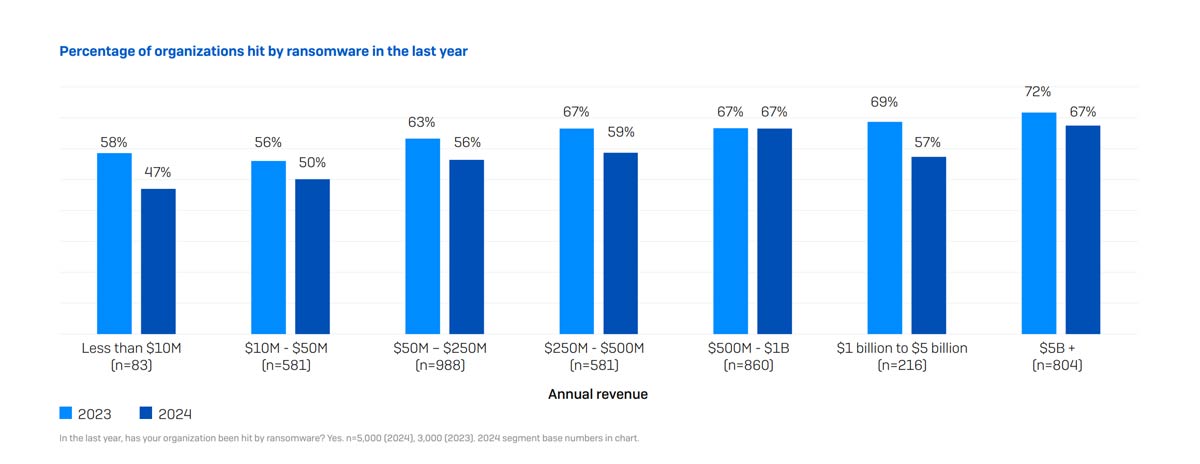 למרות דמי הכופר מרקיעי השחקים, מצביע דו"ח 2024 על ירידה בהיקף מתקפות הכופר עם 59% מהארגונים שנפגעו, לעומת 66% בשנת 2023. בעוד שהנטייה להיפגע מתוכנות כופר עולה ככל שהכנסות הארגון גבוהות יותר, גם ארגונים קטנים (עם הכנסות של פחות מ-10 מיליון דולר) מהווים מטרה למתקפות כופר, ושיעור הארגונים הקטנים שנפגעו בשנה האחרונה עומד על קצת פחות ממחצית (47%).