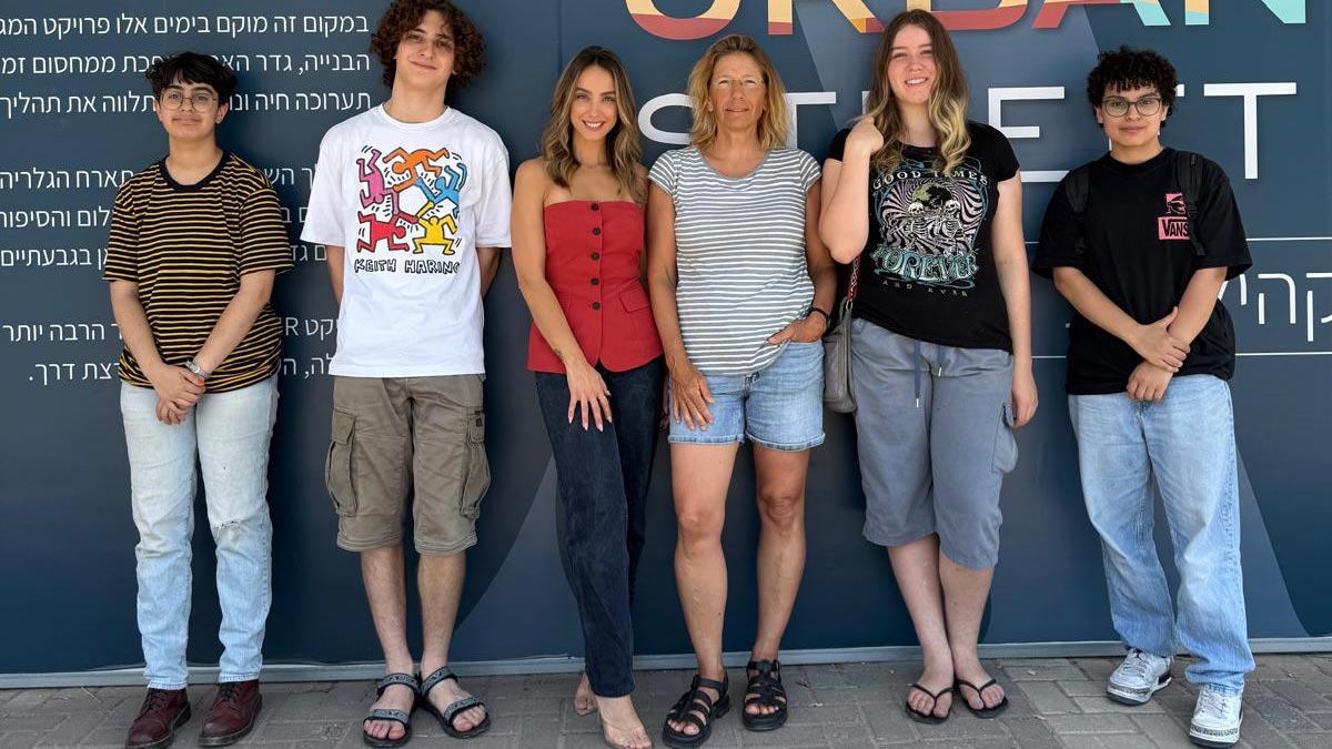 תמונה של שירי דורון, ראשת החוג לאמנות חזותית של תיכון קלעי בגבעתיים יחד עם תלמידים ועם ג'יל יהב מנהלת שיווק ב-ICR - על רקע הגלריה של ICR. באדיבות ICR.