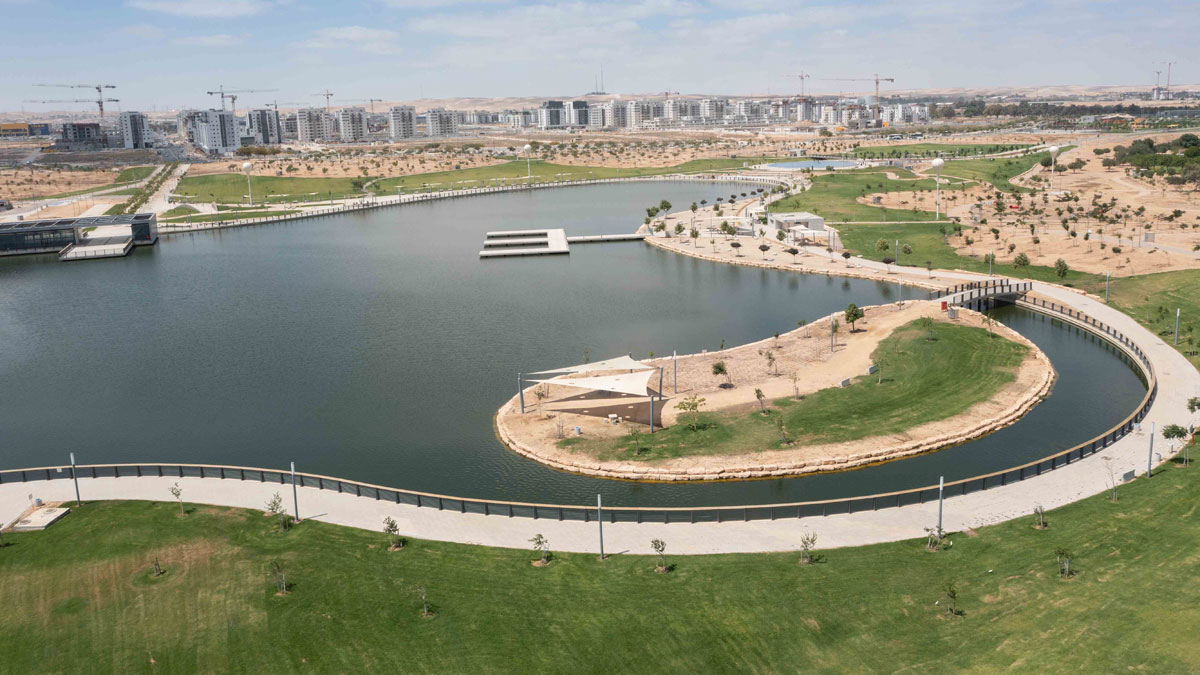שכונת הפארק בבאר שבע מבט אווירי על האגם ומתחם בריכות השחייה שיוקמו בסמוך אליו. צילום: דיאגו מיטלברג