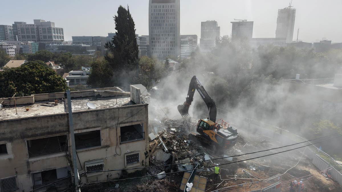ההריסה של הבניינים בעולי הגרדום 18-22 בתל אביב קבוצת רם אדרת. צילום: SKYPRO