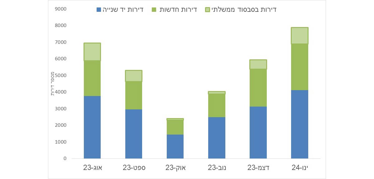 54.7% מהדירות שנמכרו בשלושת החודשים נובמבר 2023-ינואר 2024 הן דירות יד שנייה, כ-9,780 דירות, עלייה של 19.3% בהשוואה לשלושת החודשים הקודמים.