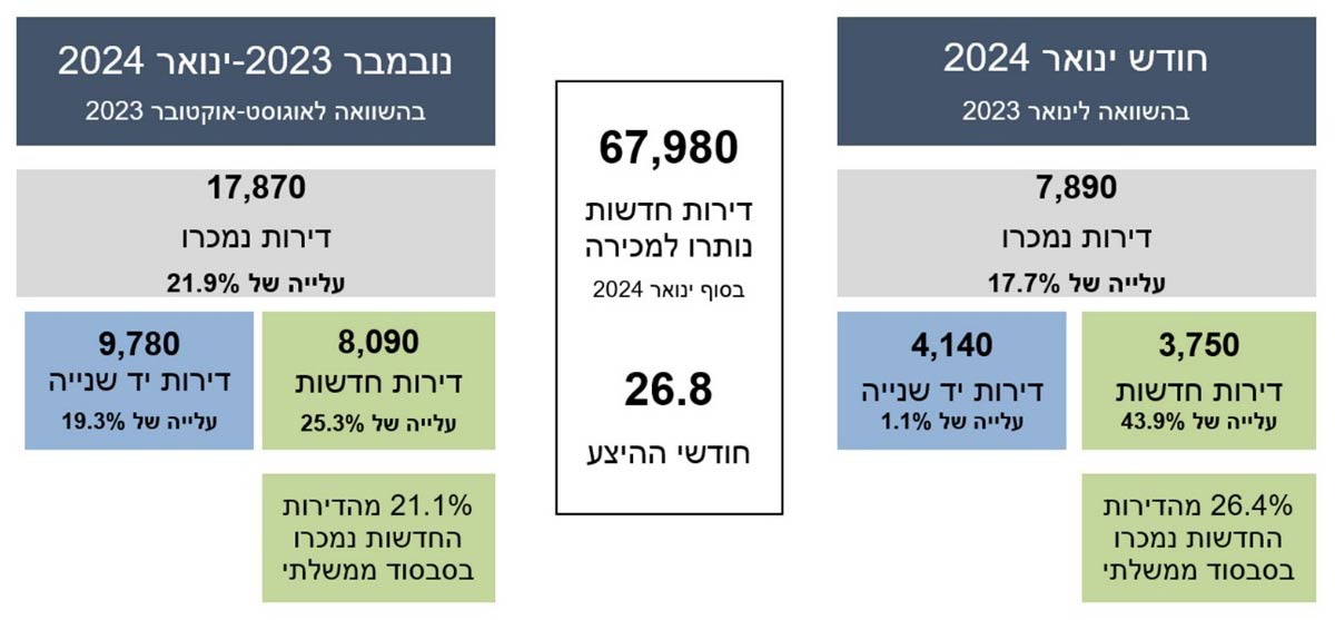 בסוף ינואר 2024 מלאי הדירות החדשות שנותרו למכירה היה כ-67,980 דירות, ומספר חודשי ההיצע (מספר החודשים שיעברו עד שכל הדירות שנותרו למכירה יימכרו) היה 26.8 חודשים.