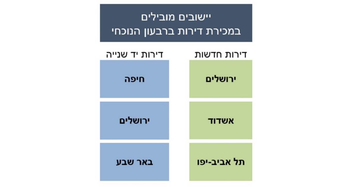 ירושלים ואשדוד מובילות במספר הדירות החדשות שנמכרו בשלושת החודשים האמורים עם יותר מ-500 דירות. בדירות יד שנייה שנמכרו באותה תקופה מובילות חיפה, ירושלים ובאר שבע עם יותר מ-600 דירות.