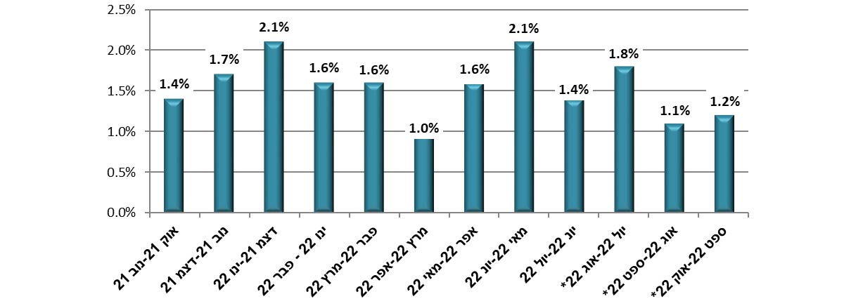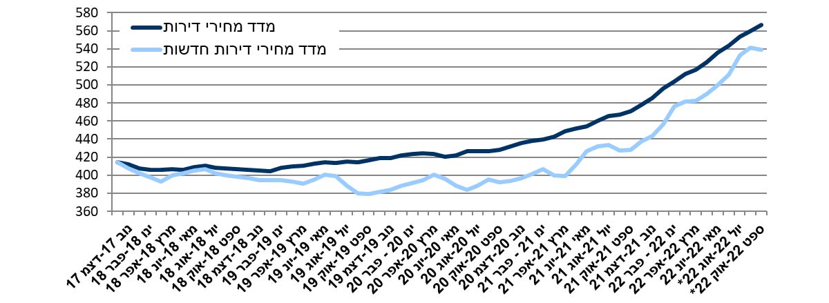 להלן נתונים על מדד מחירי דירות הכולל דירות חדשות ודירות מיד שנייה (שינוי מחירים בניכוי איכות): השוואת מחירי העסקאות שבוצעו בחודשים ספטמבר 2022 עד אוקטובר 2022 למחירי העסקאות שבוצעו בחודשים אוגוסט 2022 עד ספטמבר 2022 מלמדת, כי מחירי הדירות עלו ב-1.2 אחוז (הנתון אינו סופי מאחר שקיימות עסקאות נוספות שבוצעו בתקופה זו וטרם דווחו).