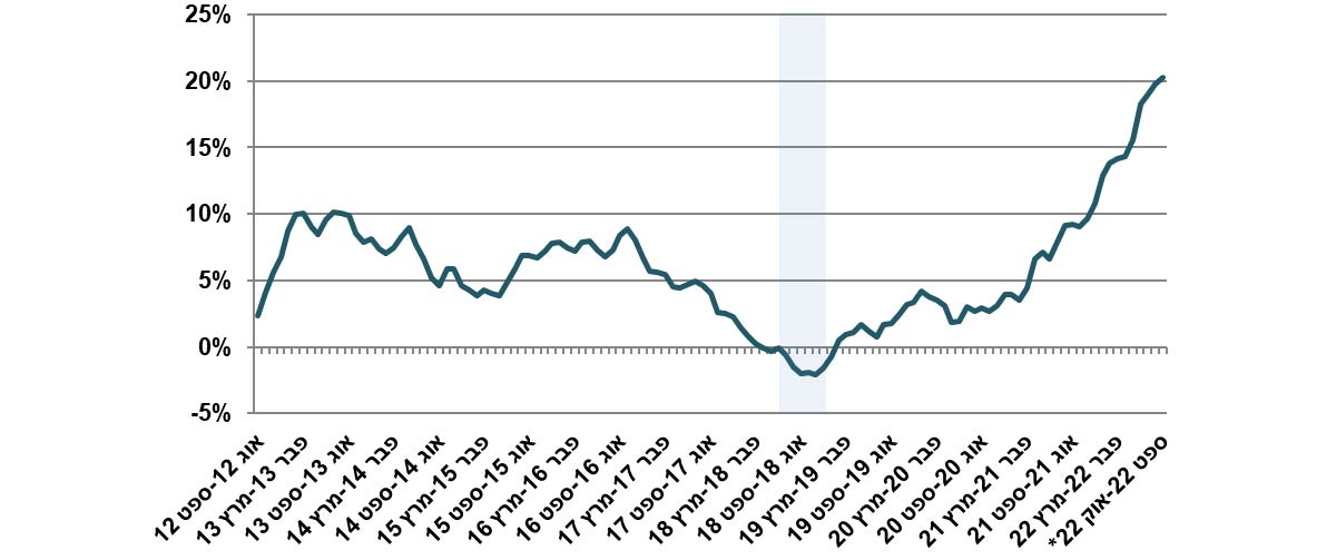 השוואת העסקאות שבוצעו מספטמבר 2022 עד אוקטובר 2022 לעסקאות מספטמבר 2021 עד אוקטובר 2021 מלמדת, כי מחירי הדירות עלו ב-20.3%. תרשים 2 מציג את אחוז השינוי השנתי במדד מחירי הדירות בעשור האחרון. אפשר לראות כי בחודשים האחרונים חלה עליית מחירים שנתית חדה יחסית לעשור האחרון. זאת לאחר התמתנות בקצב עליית המחירים, שהחלה בשנת 2016, עד כדי ירידות מחירים בשלושת הרבעונים האחרונים של שנת 2018 (האזור המוצלל).
