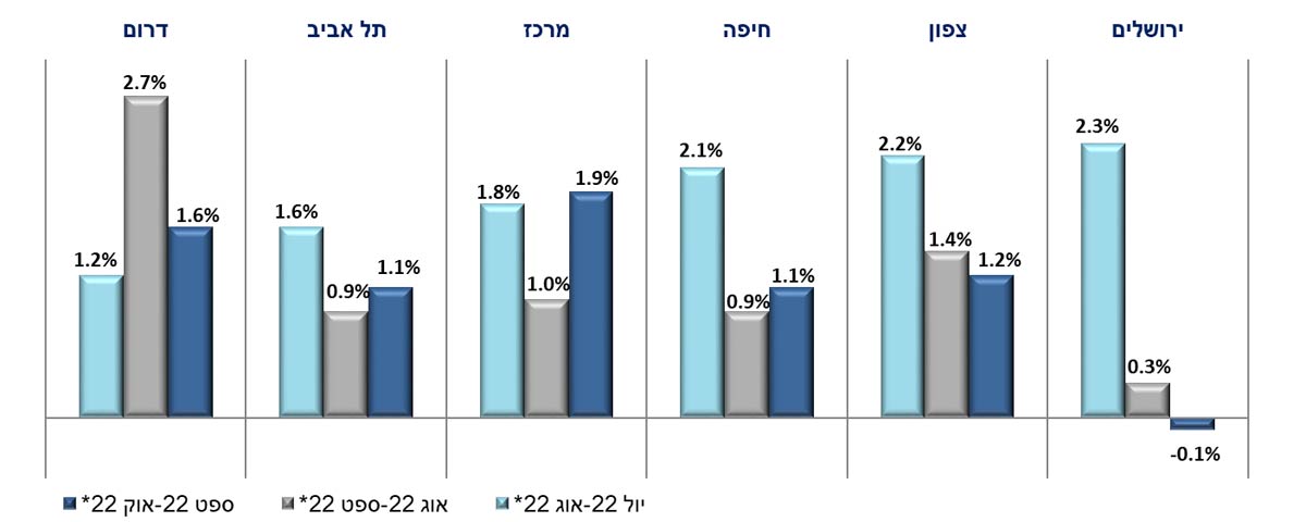 על פי השוואת העסקאות שבוצעו בתקופה הנוכחית לעומת התקופה המקבילה אשתקד - קרי ספטמבר 2022 עד אוקטובר 2022 לעומת ספטמבר 2021 עד אוקטובר 2021 - נרשמו עליות מחירים דו-ספרתיות בכל המחוזות: מרכז (22.5%), צפון (22.5%), תל אביב (19.9%), חיפה (19.9%), דרום (18.7%) וירושלים (16.6%)