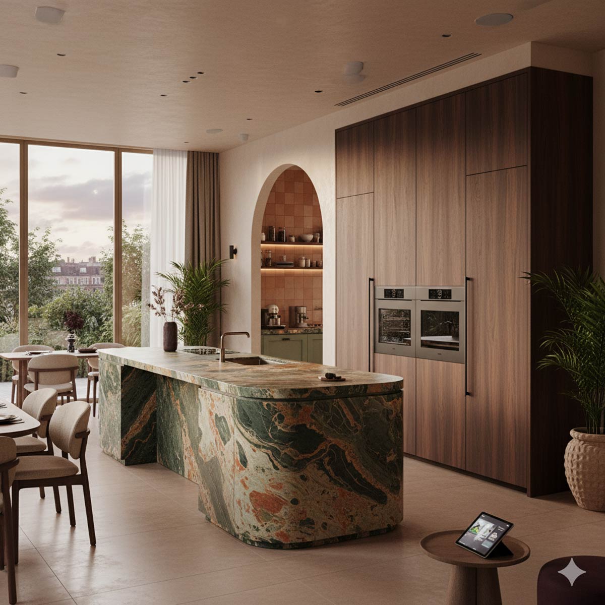 הפלטה הכרומטית של המטבח החדש מתחממת ומתרחקת מהלבן הסטרילי והאפור הקר ששלטו בשנים האחרונות. את מקומם תופסים גוונים אדמתיים וחמים, בהם טרקוטה, ירוק מרווה, גווני בז' עמוקים ונגיעות של כחול עמוק או בורגונדי ליצירת הדגשים. גם הגיאומטריה משתנה, וקווים ישרים וחדים מפנים את מקומם לצורות רכות ואורגניות. קשתות בעיצוב פתחים, איים בעלי פינות מעוגלות ועיצובים קימוריים מכניסים תחושת זרימה ורכות לחלל, והופכים אותו למזמין ופחות תעשייתי.