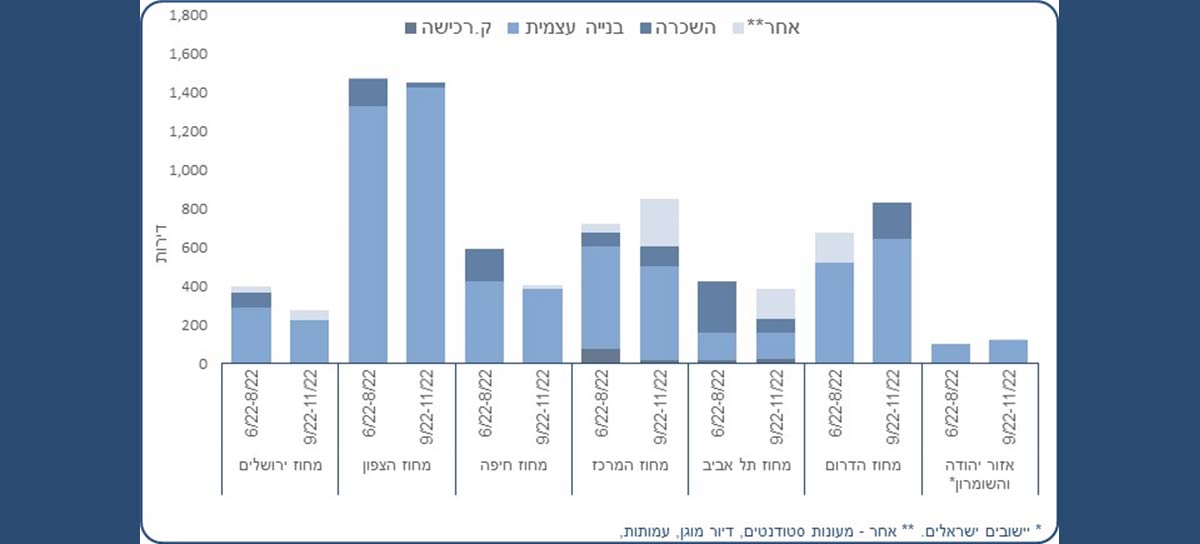 בשלושת החודשים ספטמבר-נובמבר 2022, 78.8% מסך הדירות שהחלה בנייתן שלא למטרת מכירה היו למטרת שימוש עצמי (בנייה עצמית ו"בנה ביתך"). מתוכן 41.6% היו במחוז צפון ו-18.6% במחוז דרום. 8.9% מהדירות נבנות למטרת השכרה.