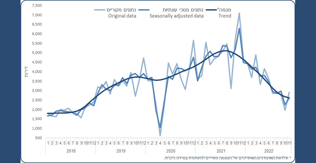 בחודש נובמבר 2022 נמכרו כ-2,900 דירות חדשות. נתוני המגמה מלמדים על ירידה של 2.1% לעומת החודש הקודם.