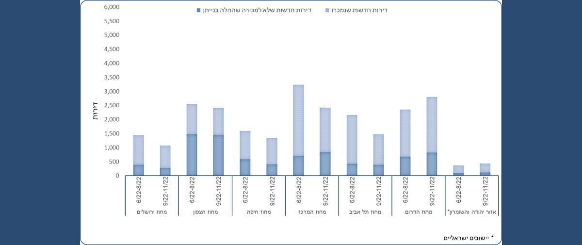 בשלושת החודשים ספטמבר-נובמבר 2022, כרבע מהדירות החדשות שנמכרו מתרכז בערים ירושלים, קריית גת, אשקלון, נתניה ותל אביב-יפו.