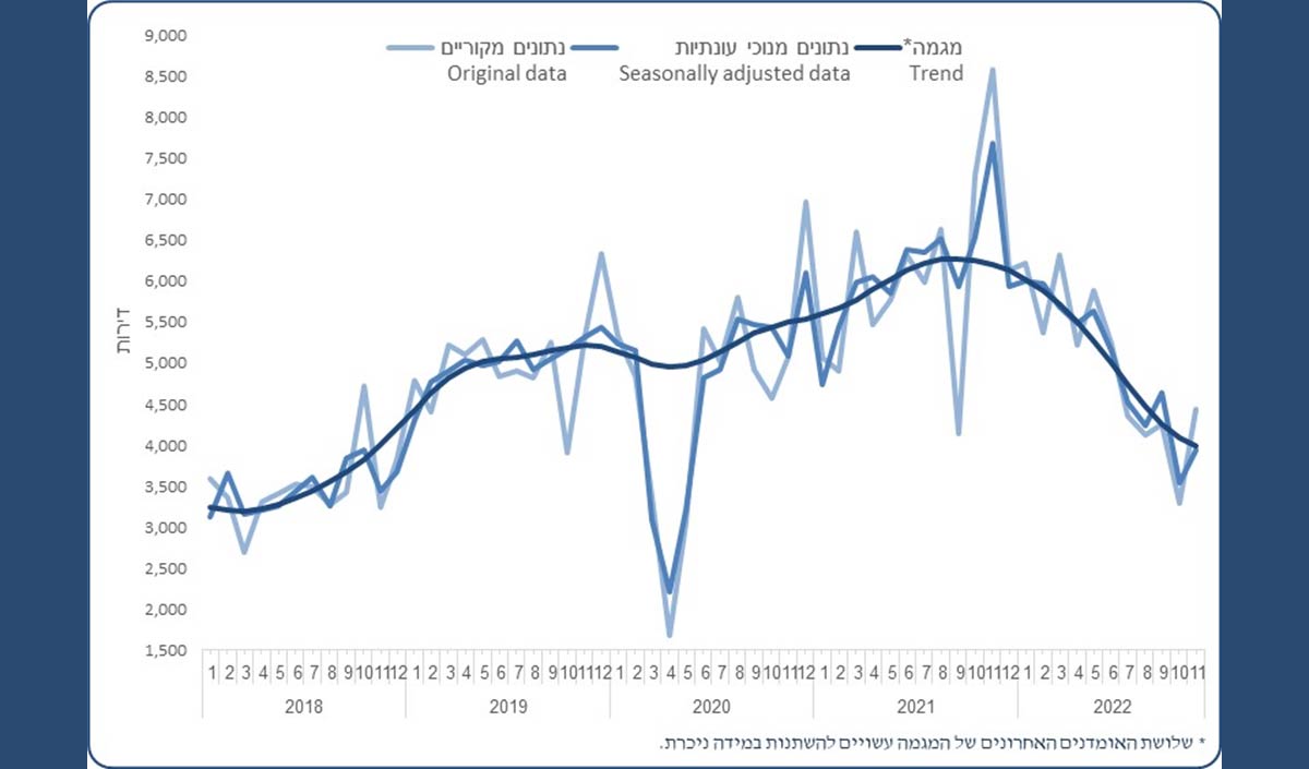 בחודש נובמבר 2022 הייתה הכמות המבוקשת של דירות חדשות כ-4,430 דירות. נתוני המגמה מלמדים על ירידה של 2.5% לעומת החודש הקודם.