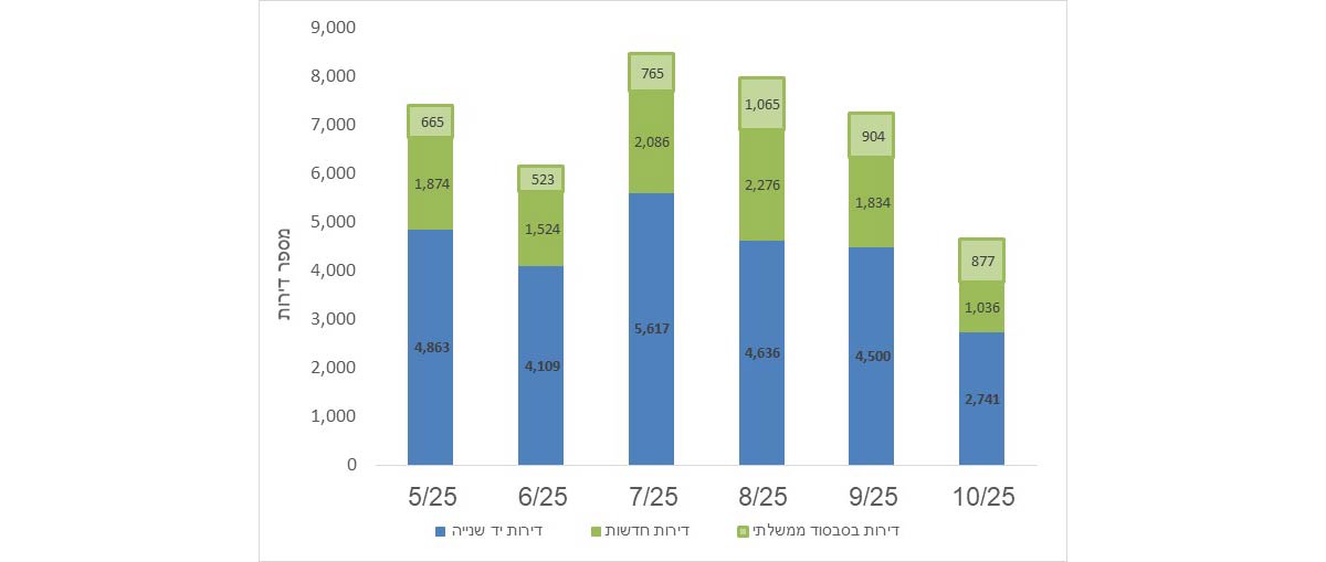 בחודש אוקטובר 2025 נמכרו 4,650 דירות, מתוכן 41.1% הן דירות חדשות, כ־1,910 דירות. מתוך הדירות החדשות כ־45.8% נמכרו בסבסוד ממשלתי. 58.9% מהדירות שנמכרו הן דירות יד שנייה, כ־2,740 דירות.