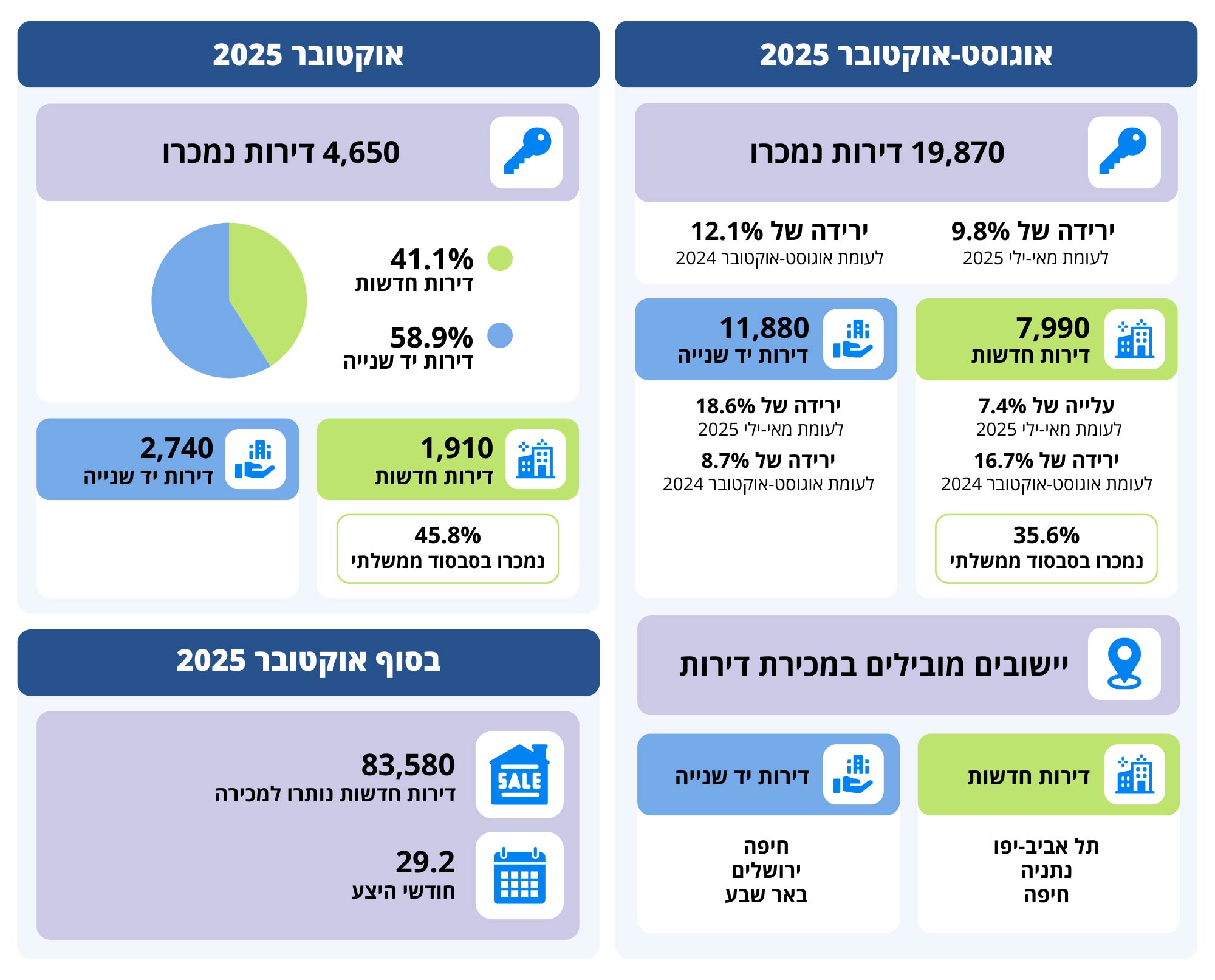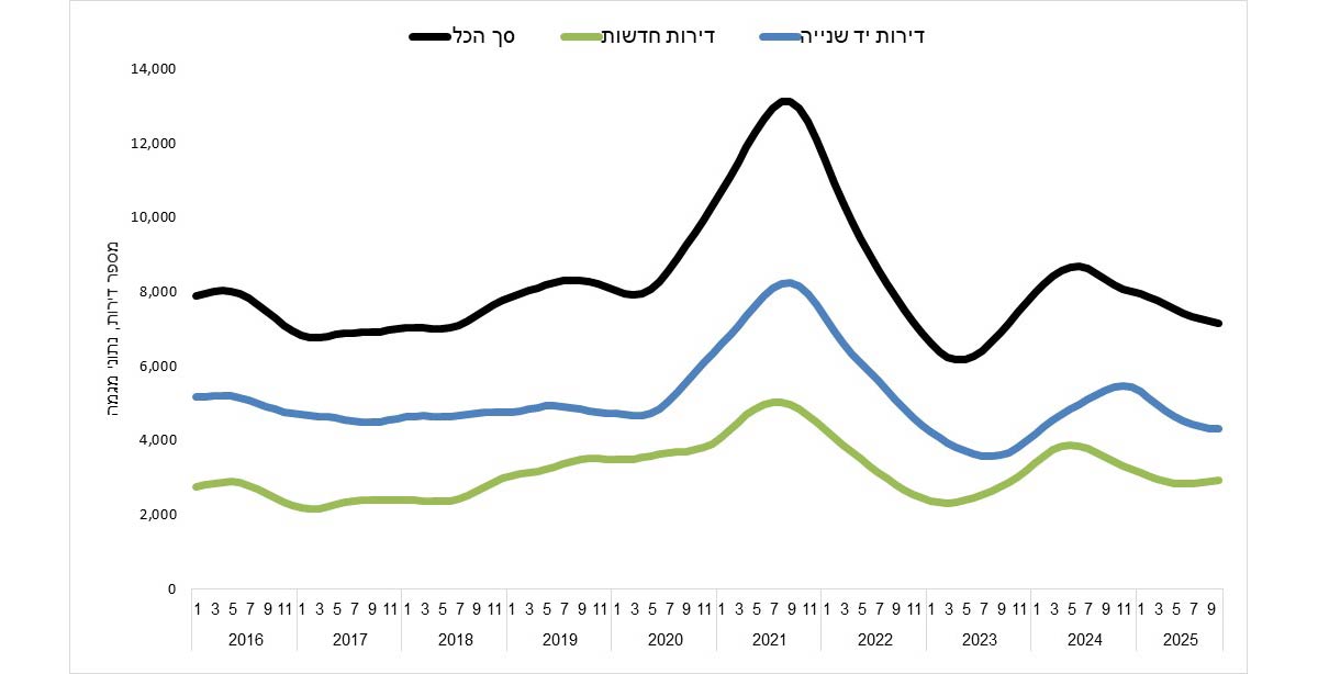 בשלושת החודשים האחרונים, אוגוסט-אוקטובר 2025, נמכרו כ־19,870 דירות, ירידה של 9.8% בהשוואה לשלושת החודשים הקודמים (מאי-יולי 2025). בניכוי עונתיות המגמה הפוכה: נצפתה עלייה בשיעור של 5.5%. בהשוואה לתקופה המקבילה אשתקד (אוגוסט-אוקטובר 2024) נצפו ירידות הן בנתון המקורי והן בניכוי עונתיות, 12.1% ו־11.6% בהתאמה.
