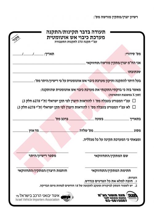 תעודה בדבר התקנת מערכת כיבוי אש אוטומטית