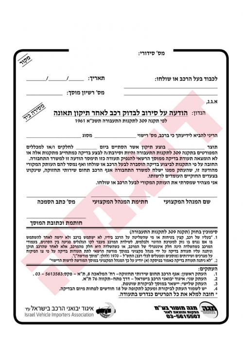 הודעה על סירוב בדיקת רכב לאחר תיקון תאונה