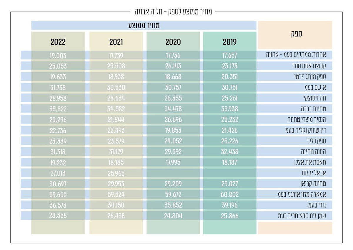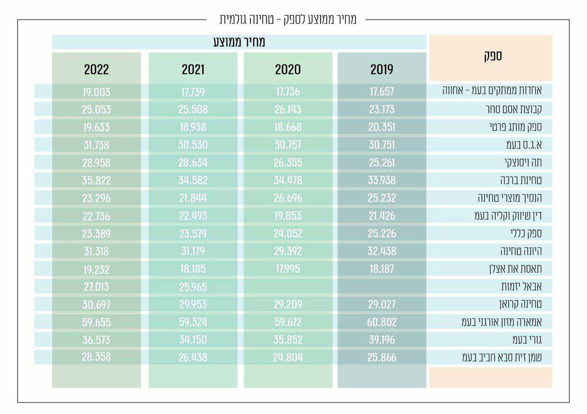 טחינה גולמית אחוה נמכרה בשנת 2019 במחיר שנתי ממוצע לקילו של 17.60 שקל, בשנים 2019-2018 היה המחיר 17.70 שקל, וכיום הוא 19 שקל. טחינה בארכה נמכרה בשנת 2019 ב-23 שקל בממוצע לק"ג, בשנת 2020 ב-26 שקל, וכיום נמכרת ב-25 שקל בממוצע. טחינה אל ארז נמכרה בשנת 2019 ב-30.70 שקל בממוצע לק"ג, כך גם בשנת 2020, וכיום נמכרת ב-31 שקל בממוצע. טחינת ירושלים נמכרה בשנת 2019 ב-25 שקל בממוצע לק"ג, עלתה בשנת 2020 ל-26 שקל, בשנת 2021 עלתה ל-28.60 שקל, וכיום נמכרת ב-28.90 שקל בממוצע.