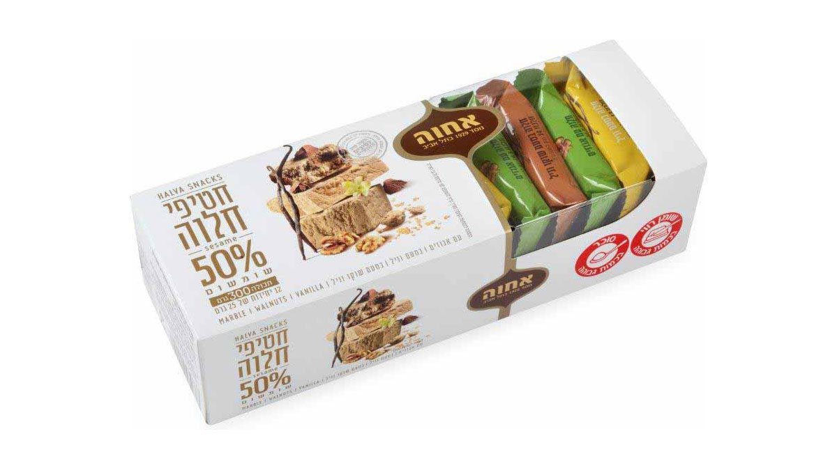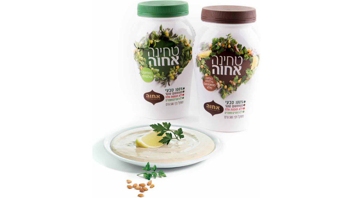 מימין לשמאל: חטיפי חלווה של חברת אחוה. צילום: יעל האן; טחינה גולמית רגילה ומלאה של חברת אחוה. צילום: דרור קליש