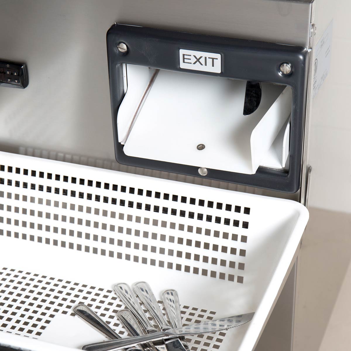 המכונה פועלת אוטומטית ומעבירה את הסכו"ם דרך שלבי הניקוי והחיטוי. האביזרים הנקיים והמפולשים נאספים בתוך סל ייחודי, שאליו הם מגיעים דרך תעלת ברזל מתוך המכונה. המכונה הוורסטילית כולה עשויה מפלדת אל-חלד עוצמתית. היא עמידה ומוכנה להפעלה במטבחים מסחריים ומוסדיים מאתגרים, שעובדים בקצב גבוה ומתמשך.
