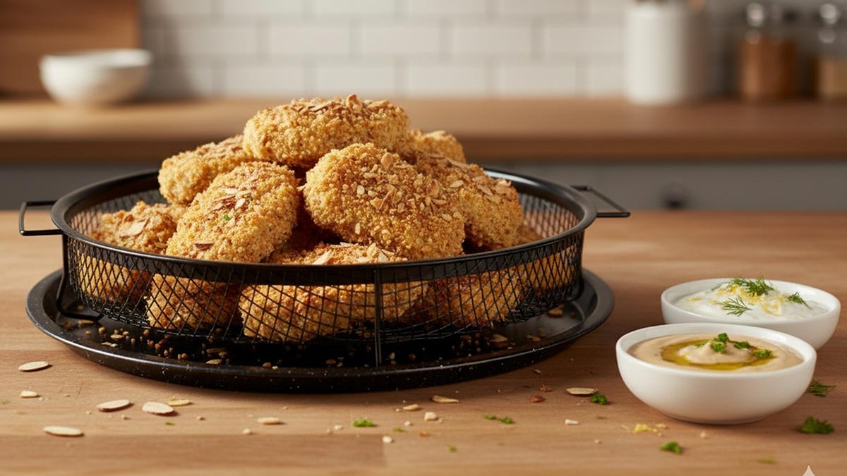 המנה הזו, המזוהה עם ילדים, עוברת שדרוג והתאמה למבוגרים. חזה עוף חתוך לקוביות נטבל בביצה ומצופה בתערובת של פירורי לחם מלאים ושקדים גרוסים. במקום טיגון עמוק, אופים בחום גבוה עד שהנאגטס מזהיבים ומתייבשים קלות מבחוץ ונשארים רכים מבפנים. השילוב של השקדים יוצר קראנץ' עדין וטעם עשיר במיוחד. המנה מוגשת לצד רוטב יוגורט עם נגיעת לימון או טחינה מתובלת.