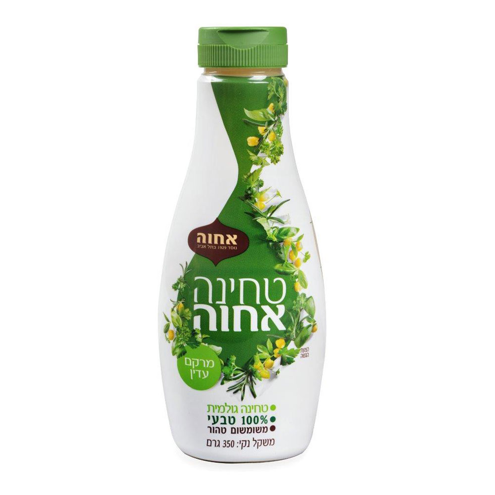 טחינה בבקבוק לחיץ של אחוה: טחינה חדשה בבקבוק לחיץ, עשויה משומשום טהור, במרקם עדין, משווקת באריזת נוחות במשקל של 350 גרם. הבקבוק בעיצוב חדיש ונוח, בעל חלונית צד שקופה לבדיקת הכמות הנותרת בבקבוק.