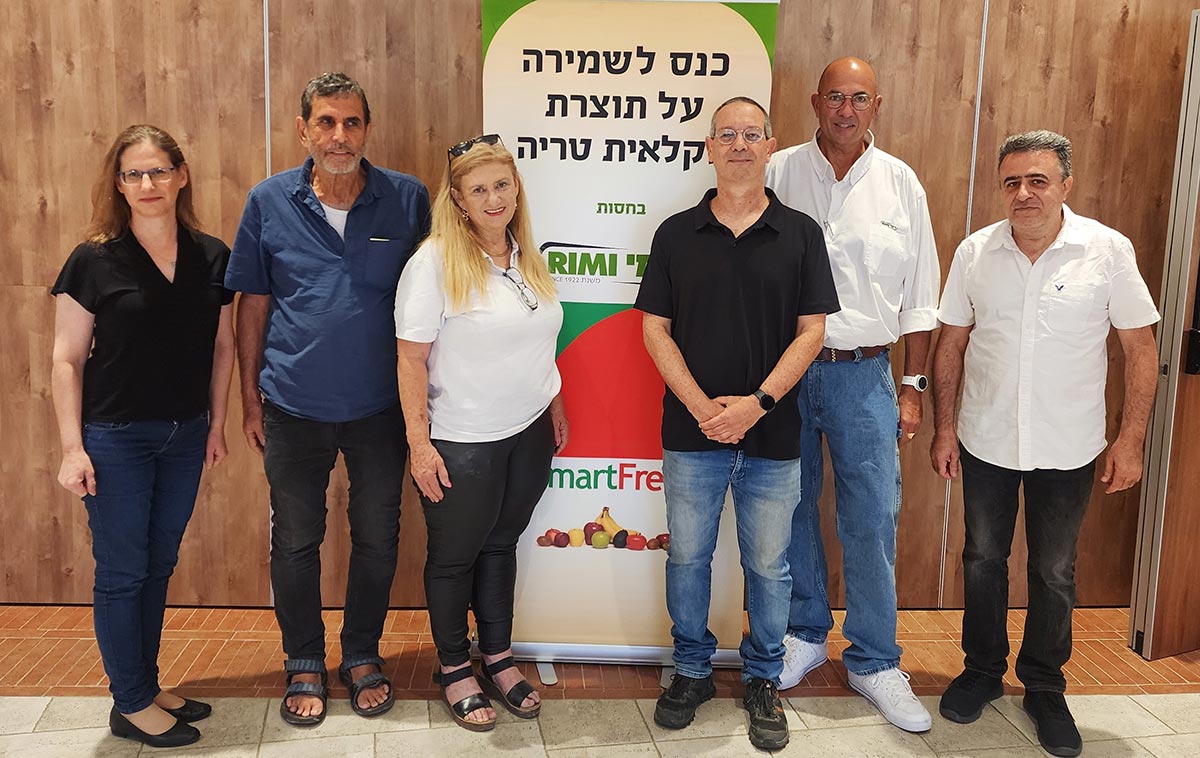 מימין - ד"ר אדי סיונוב מנהל המכון לחקר תוצרת חקלאית ומזון במכון וולקני; יוסי שטרן מנהל מוצר 'סמארטפרש הרוויסטה' ברימי; ד"ר דני גמרסני מכון המחקר מיגל; חיה רק יהלום מנהלת מו"פ צפון והמרכז לחדשנות בפוסטהרבסט במיגל; משה ברוקנטל מנהל ענף הפירות במועצת הצמחים; ד"ר כרמית זיו מכון וולקני. צילום: מכון המחקר מיגל