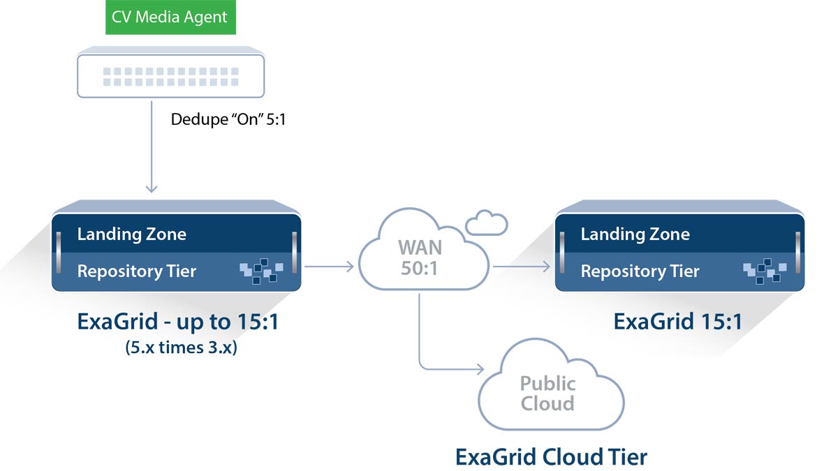 פתרון הגיבוי לאחסון בשכבות של ExaGrid כבר יכול לבטל כפילויות נתונים במערכות Commvault ולהמשיך לבטל כפילויות בשיעור של פי שלושה יותר מיכולת ביטול הכפילויות של Commvault, כשהתוצאה היא חיסכון עצום בנפח האחסון. כעת, פתרון בגיבוי לאחסון בשכבות של ExaGrid יכול לאסוף נתוני Commvault דחוסים ולבצע פעולת ביטול כפילויות נוספת על הנתונים.