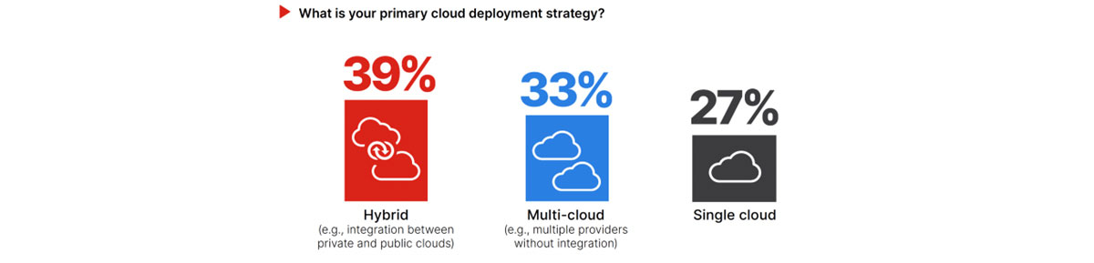 לפי ממצאי הדוח, מרבית הארגונים בוחרים בגישה של פריסת ענן היברידי (39% לעומת 36% בשנה שעברה) או ריבוי עננים (33%) כדי לשלב מגוון שירותים, לספק יכולת גדילה או להבטיח המשכיות עסקית. 76% מהארגונים משתמשים כיום בשתי ספקיות ענן או יותר. AWS ו-Microsoft Azure נמצאות בראש הרשימה, אבל Google Cloud ו-Oracle מגבירות במהירות את ההשקעה שלהן ואת נתח השוק.