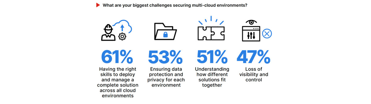 כאשר מרבית הארגונים בוחרים באסטרטגיית ענן היברידי או ריבוי עננים, הם מתמודדים עם מורכבות גוברת ואתגרי אבטחה. המחסור במומחי אבטחה מיומנים נהפך לאתגר האבטחה המרכזי (61% לעומת 57% בשנה שעברה). אחריו נמצאים הגנת נתונים (53%), הבנה כיצד פתרונות שונים משתלבים יחד (51%) ואובדן נראות ובקרה (47%). פישוט המורכבות הוא המפתח להצלחה.