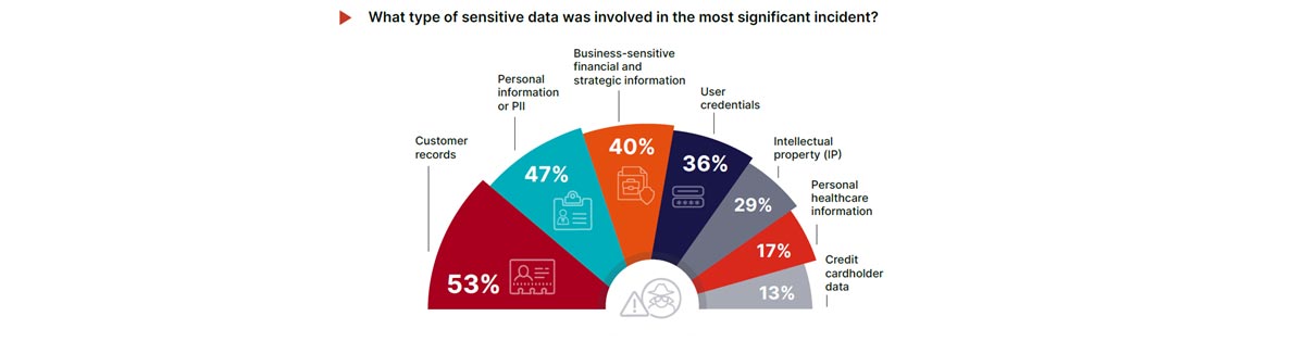 הדוח חושף גם את סוגי הנתונים הרגישים הנמצאים לרוב בסיכון. רשומות של לקוחות (53%) ומידע המאפשר זיהוי אישי (47%) נמצאים בראש הרשימה, אחריהם תוכניות רגישות עבור העסק (40%), פרטים מזהים של משתמשים (36%) וקניין רוחני (29%).