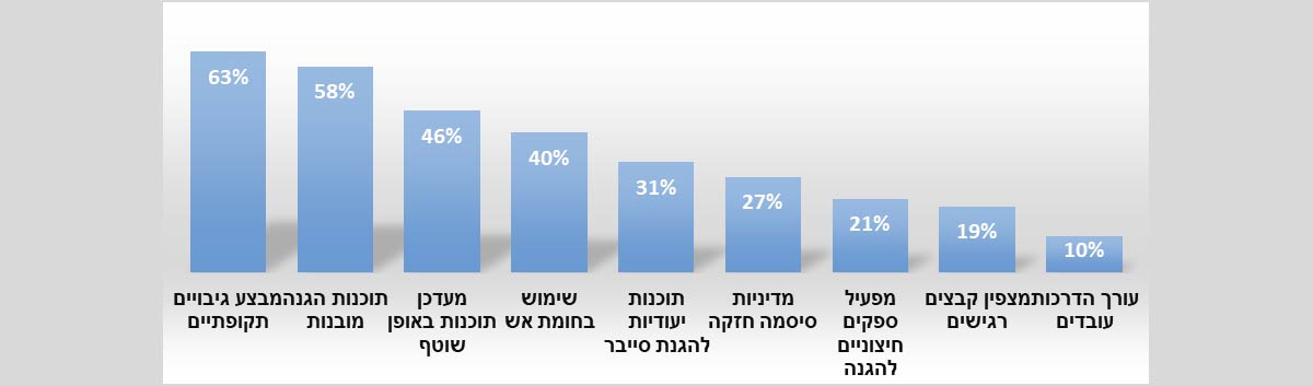 מבין 48% העסקים שמשתמשים באמצעי התגוננות - 18% משתמשים באמצעי התגוננות אחד, 7% משתמשים בשני אמצעי התגוננות, ו-23% משתמשים בשלושה אמצעי התגוננות או יותר. אמצעי ההתגוננות השכיחים ביותר הם ביצוע גיבויים תקופתיים ושימוש בתוכנות הגנה מובנות.