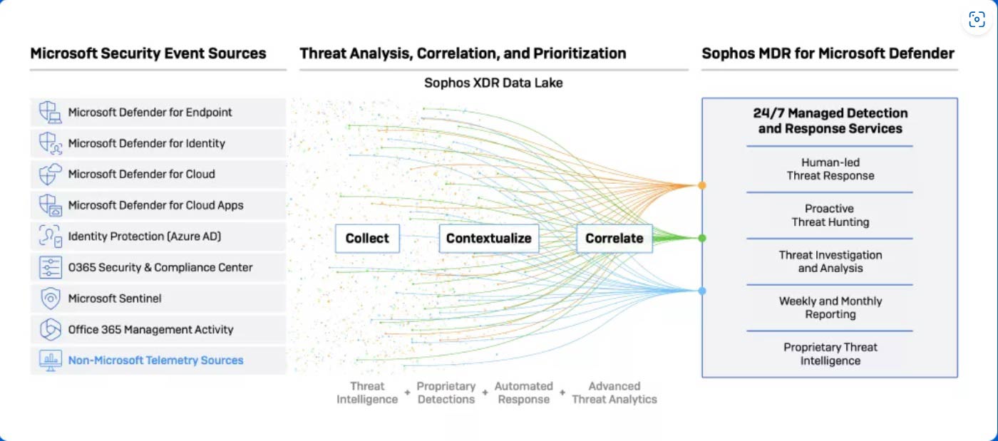 Sophos MDR for Microsoft Defender משלב טלמטריה ממגוון רחב של כלי אבטחה עבור Microsoft Security. בניגוד להצעות MDR אחרות המגבילות את התמיכה ב- Microsoft Defender for Endpoint או Microsoft Sentinel ומספקות יכולות תגובה מינימליות לאיומים, ה- MDRשל סופוס מחזק את חבילת האבטחה הרחבה יותר של Microsoft.