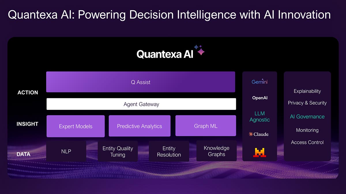 בניגוד לכלי אנליטיקה או פלטפורמות מודל קונבנציונליים שיכולים לפעול בנפרד, Quantexa AI מחברת כל שכבה של תבונה, החל מהאחדת נתונים בסיסים ועד להיסק ופעולה, בסביבה נשלטת אחת. Quantexa AI ממנפת צינורות NLP, אנליטיקת חיזוי, לימוד מכונה של גרפים וסוכני בינה מלאכותית כדי לספק תובנות ניתנות להסבר ולסייע לקבלת החלטות שניתנת לביקורת מלאה.