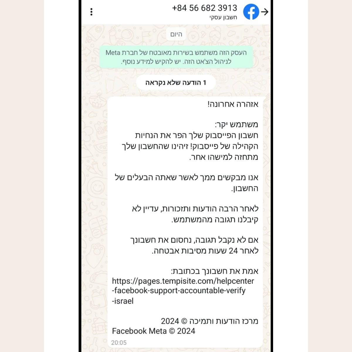 ״התקבלו עשרות רבות של פניות במהלך הימים האחרונים - הנוכלים שולחים הודעת וואטסאפ לפיה המשתמש הפר כביכול את מדיניות פייסבוק תוך דרישה ללחוץ על לינק ולמלא פרטים כתנאי לשחרור החשבון- מדובר בהונאה״ כך מזהיר איגוד האינטרט הישראלי בהודעה רשמית לציבור מפני גל הונאות רחב היקף נגד ישראלים בוואטסאפ שמטרתו לגנוב את פרטי כרטיסי האשראי מאלו שנופלים ברשת.