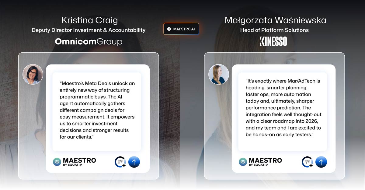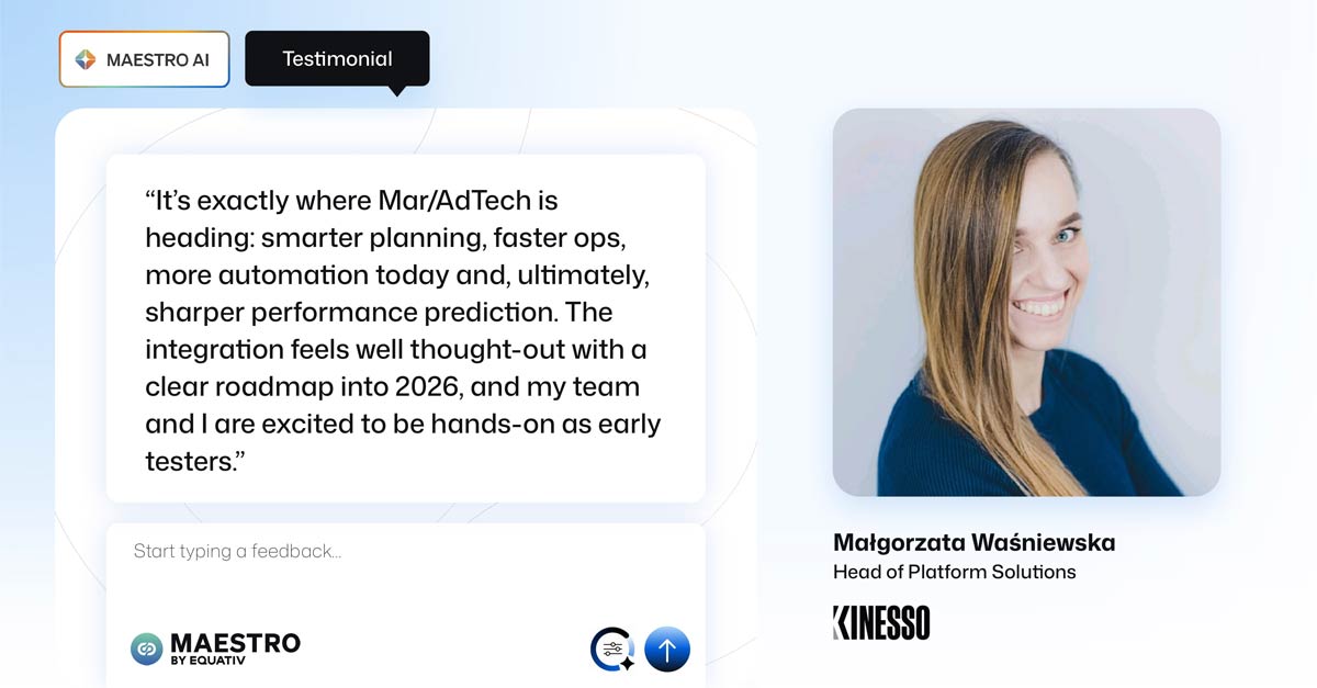 "הייתה לי הזדמנות לבדוק את הבטא של סוכן הבינה המלאכותית החדש של Maestro —זה בדיוק לאן ש-Mar/AdTech הולכת: תכנון חכם יותר, מבצעים מהירים יותר, יותר אוטומציה היום, ולבסוף, תחזית ביצועים חדה יותר. האינטגרציה מרגישה מתוכננת היטב עם מפת דרכים ברורה ל-2026, והצוות שלי ואני נרגשים להיות מעורבים כבודקים מוקדמים", סיכם מלגורזטה וושניייבסקה, ראש פתרונות פלטפורמה ב-Kinesso.