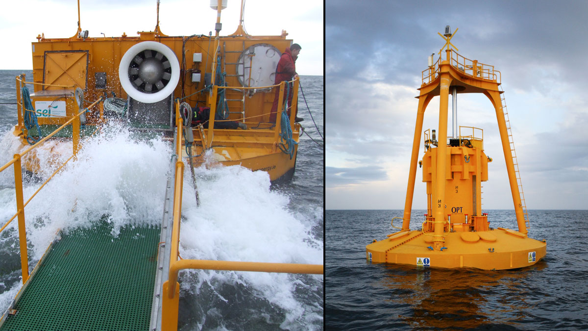 מימין: מצוף ללכידת אנרגיית גאות ושפל. הטורבינה לוכדת את האנרגיה וגנרטור ממיר את האנרגיה לחשמל. מקור: NREL. משמאל: מערכת ללכידת אנרגיה קינטית של גלים  150 kW PowerBuoy® של אושן פאוור טכנולוג'יז. מקור: Ocean Power Technologies