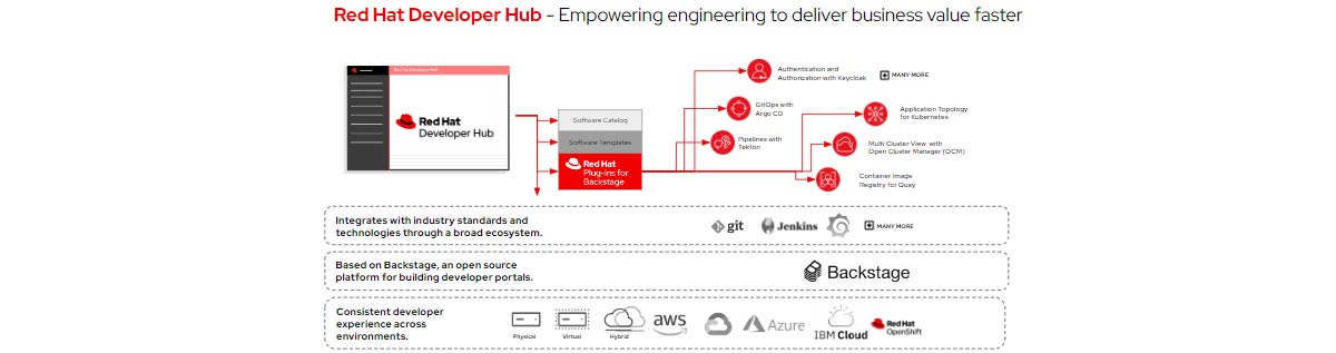 פלטפורמת Red Hat Developer Hub מטפלת באתגרים המרובים באמצעות פורטל בשירות עצמי, המרכז יחד את כל המידע הדרוש למפתחים, כולל גישה למגוון ממשקי תוכנה, קטלוג תוכנה אחוד ותיעוד כחלק מהפיתוח. מדובר בסביבה פשוטה לניהול עבור צוותי פיתוח, כאשר גם חברי צוות חדשים יכולים למצוא בקלות רבה יותר את מה שהם צריכים ולהימנע מ"המצאת הגלגל". התקינה בעלת החופש למרחב כלים גדול מעלה בצורה דרמטית את היעילות והניצולת של המפתחים ומונעת תסכולים משימוש בכלים לא נכונים.