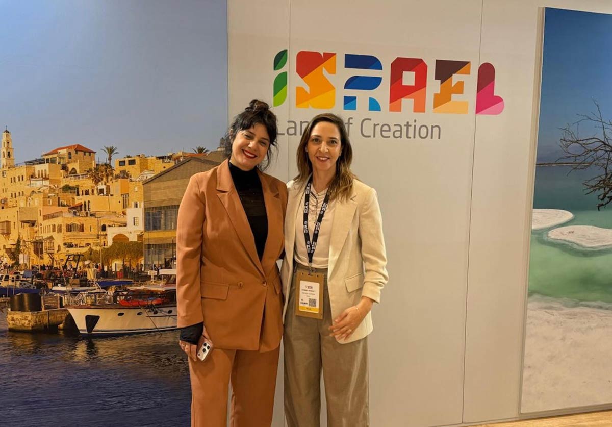 סיון דטאוקר מנכלית ההתאחדות המלונות בישראל עם שמרית ברזילי מנהלת השיווק בתיירות עין גב- ליד הביתן הישראלי בתערוכת WTM בלונדון. צילום: אלבום פרטי