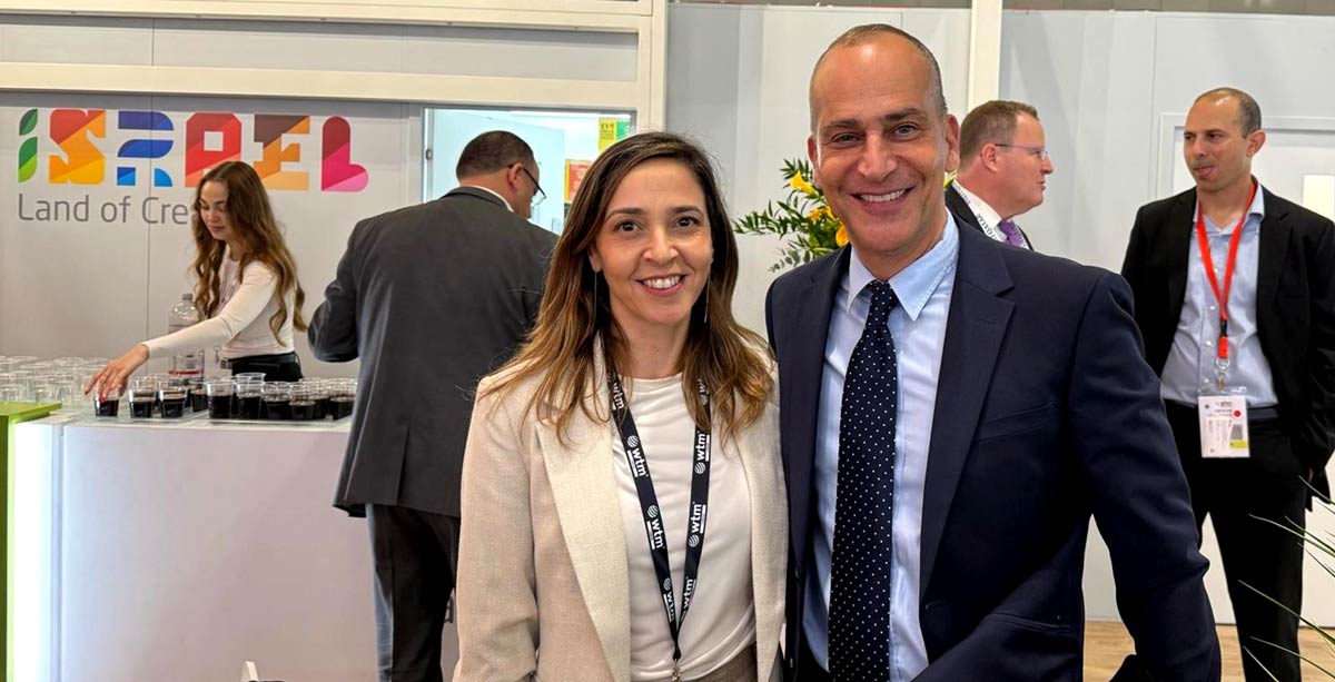 אלי כהן נשיא התאחדות המלונות בישראל עם שמרית ברזילי מנהלת השיווק בתיירות עין גב- ליד הביתן הישראלי בתערוכת WTM בלונדון. צילום: אלבום פרטי