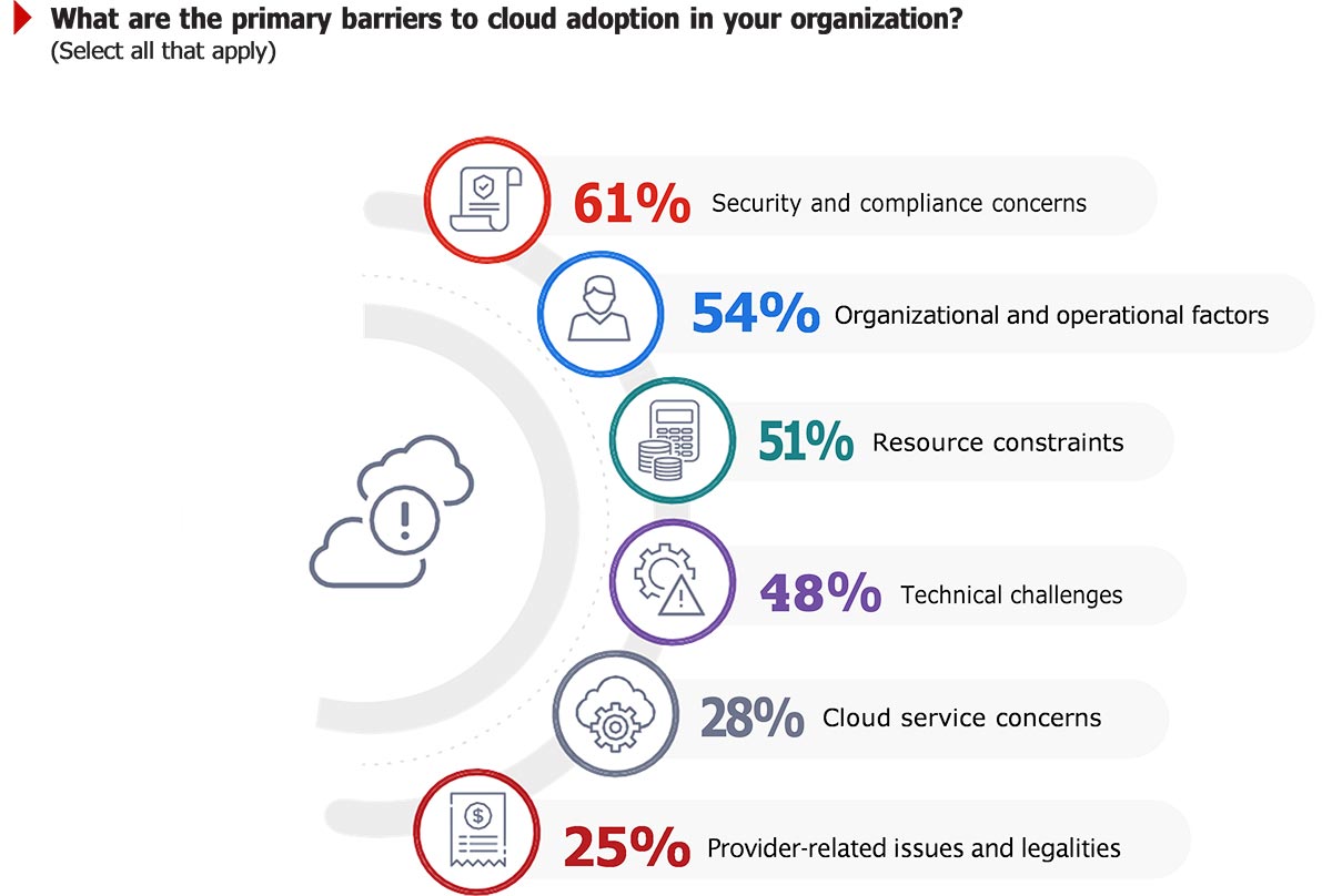 למרות שהמעבר לענן מציע יתרונות משמעותיים, הוא גם מביא עמו אתגרי אבטחה משמעותיים, כאשר 61% מהמשיבים דיווחו כי דאגות אבטחה ותאימות מהוות את החסם העיקרי למעבר לענן. החסמים המרכזיים הנוספים למעבר לענן כוללים גורמים ארגוניים ותפעוליים (54%), מגבלות של משאבים (51%) ואתגרים טכניים (48%).