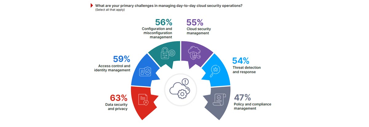 בהתייחסות לאתגרים המרכזיים של ניהול פעולות אבטחת הענן, בין הבעיות הדחופות ביותר שזוהו היו אבטחה ופרטיות הנתונים (63%), בקרה גישה וניהול זהויות (59%) וניהול תצורות ותצורות שגויות (56%), במיוחד עם ההתרחבות של סביבות ענן היברידי וריבוי עננים. לדוגמה, ספקי בריאות המעבירים את רישומי המטופלים לענן, מוכרחים לעמוד בדרישות HIPAA, תוך שמירה על מידע רגיש.