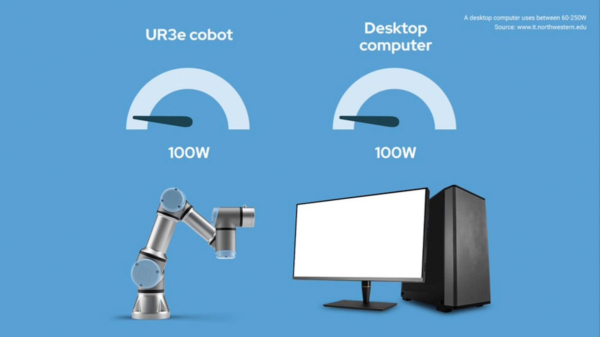 על פי נתוני UR, הקובוטים שלה מצריכים לפעולה סדירה אותה כמות חשמל הנדרשת להפעלת מכשירי החשמל הביתיים היומיומיים. UR3e צורך רק 100W בממוצע - כמות האנרגיה הנדרשת להפעלת מחשב שולחני ממוצע. UR5e והדור החדש ביותר של קונסולות המשחקים, שניהם משתמשים ב-200W להפעלה סדירה.