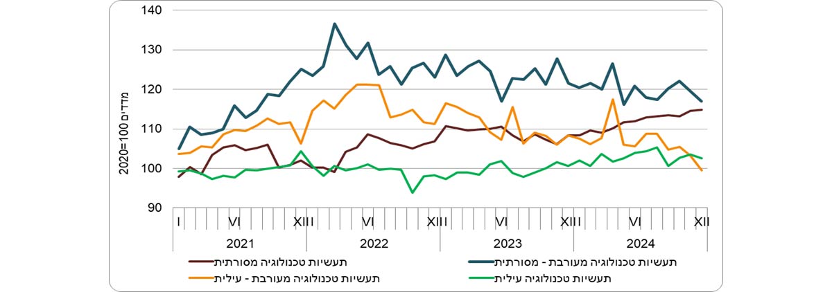 מדד המחירים של יצוא תעשיות טכנולוגיה מעורבת מסורתית ירד בשנת 2024 ב-2.9%, בהמשך לירידה של 3.8% בשנת 2023. נתונים מפורטים לפי ענפי כלכלה מלמדים על ירידה של 9.2% במדדי המחירים ביצוא של ענף ייצור נפט מזוקק בשנת 2024, בהמשך לירידה של 18.6% בשנת 2023. יצוא תעשיות טכנולוגיה מעורבת מסורתית הוא כ-15% מהיצוא התעשייתי (ללא יהלומים).