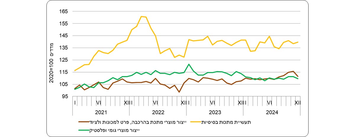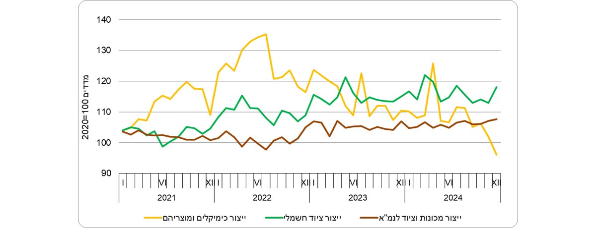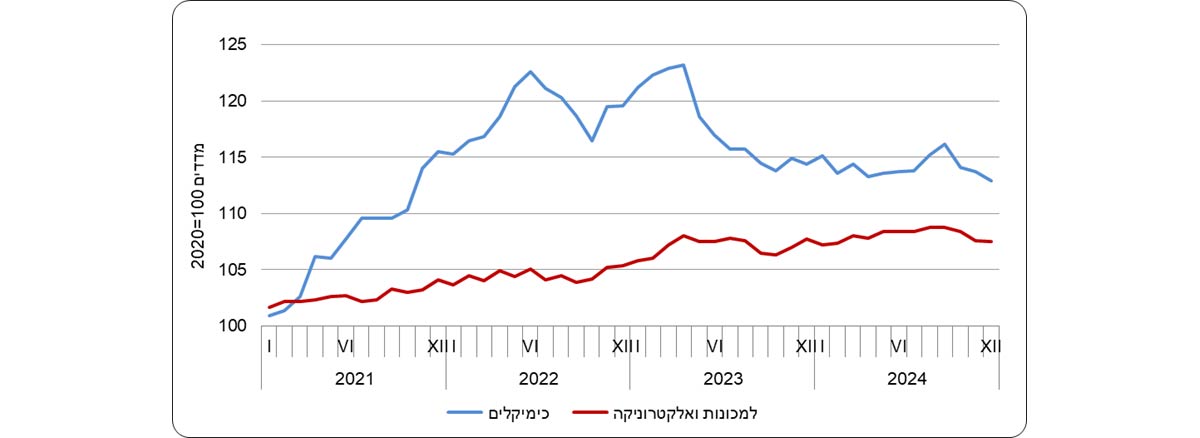 מדד המחירים של יצוא תעשיות טכנולוגיה מעורבת עילית ירד ב-3.7% בשנת 2024, בהמשך לירידה של 4.5% בשנת 2023. נתונים מפורטים לפי ענפי כלכלה מלמדים על ירידה במדד המחירים של יצוא ענף ייצור כימיקלים ומוצריהם ב-5.9% בשנת 2024, בהמשך לירידה של 8.4% בשנת 2023. היצוא של תעשיות טכנולוגיה מעורבת עילית הוא כ-39% מהיצוא התעשייתי (ללא יהלומים).